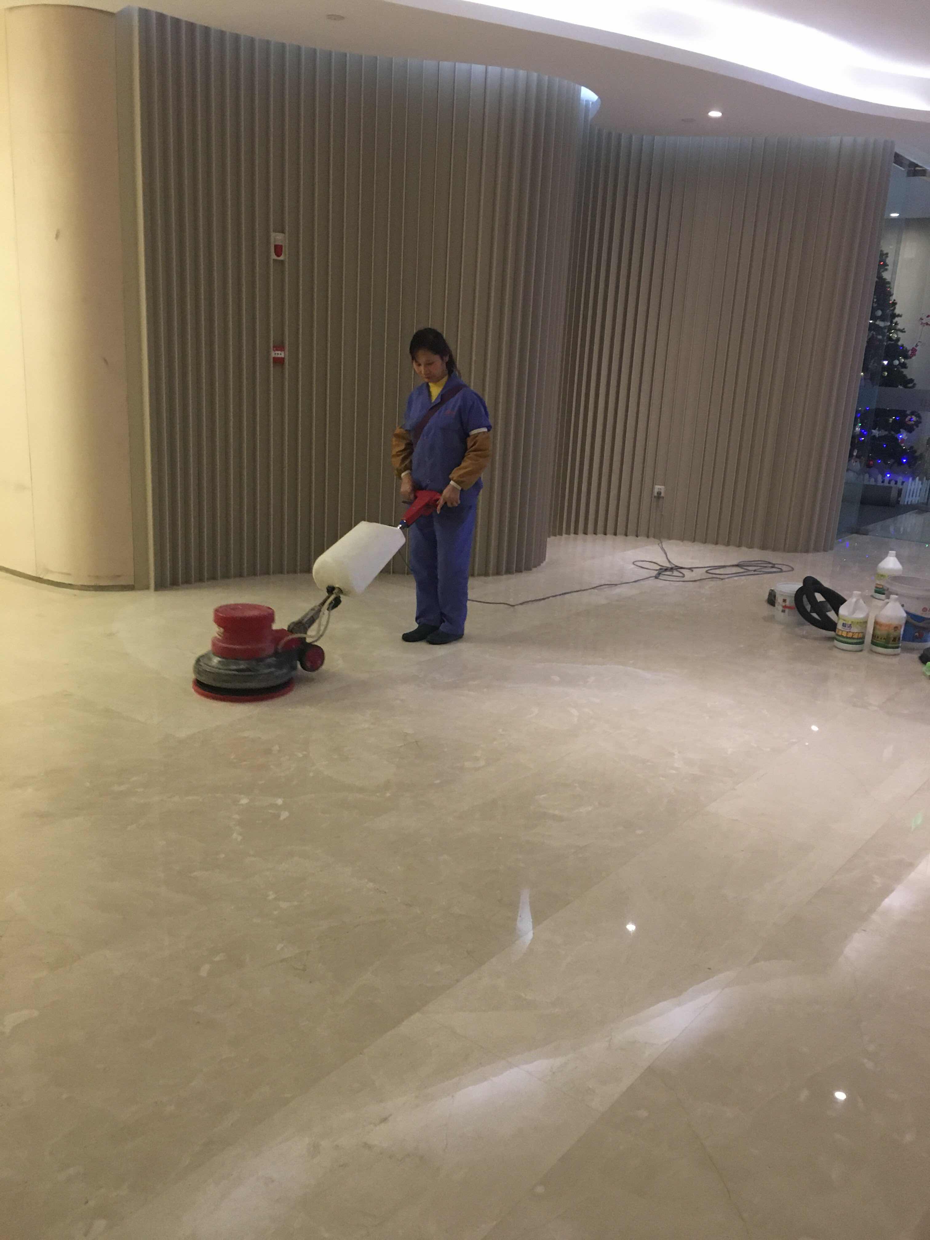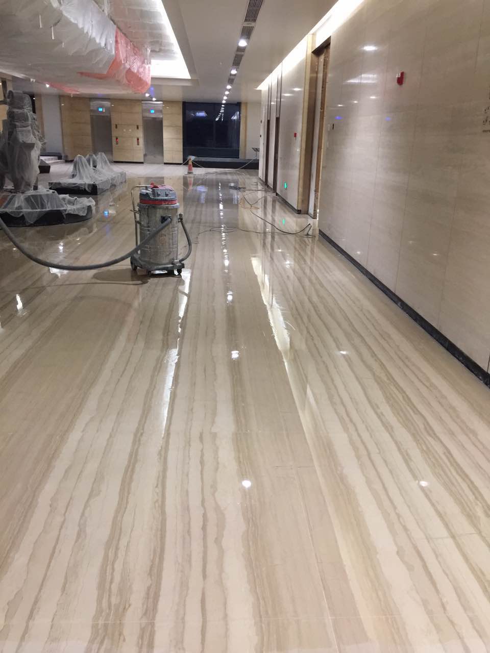 2、晶面硬化處理:石材結(jié)晶硬化處理,第一遍要用加硬做基底,作加硬的時候,將加硬劑噴在石材上,要將其打磨均勻,以免導(dǎo)致石材表面硬度不一,且導(dǎo)致石材加光后表面的光澤度不均勻;然后再用加光劑進(jìn)行拋光處理,作加光的時候,必須把加硬劑所處理的面積全部蓋上,這樣才能使石材的每一部分都得到家光處理;用加硬加光的操作方法反復(fù)做5-6遍左右,才能達(dá)到石材結(jié)晶硬化處理的效果。一般石材的光亮度基本上都達(dá)到80度以上;將做完結(jié)晶硬化的石材,全部用一個新的鋼絲棉墊重新拋光一遍,將施工時漏掉沒有拋干凈的加光加硬劑清理干凈;
